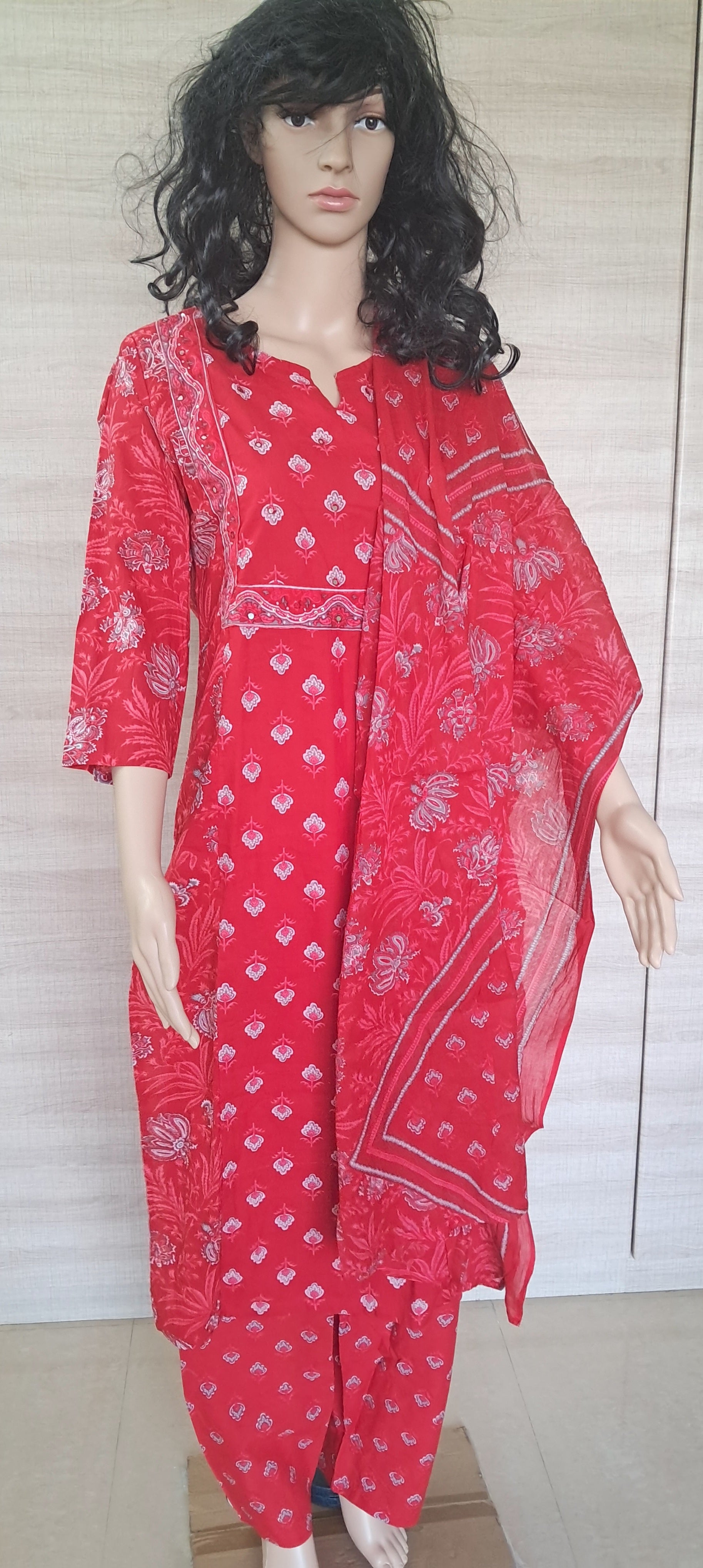 Women kurti with pant and dupatta | Straight cut | Tomato red small bhutta set